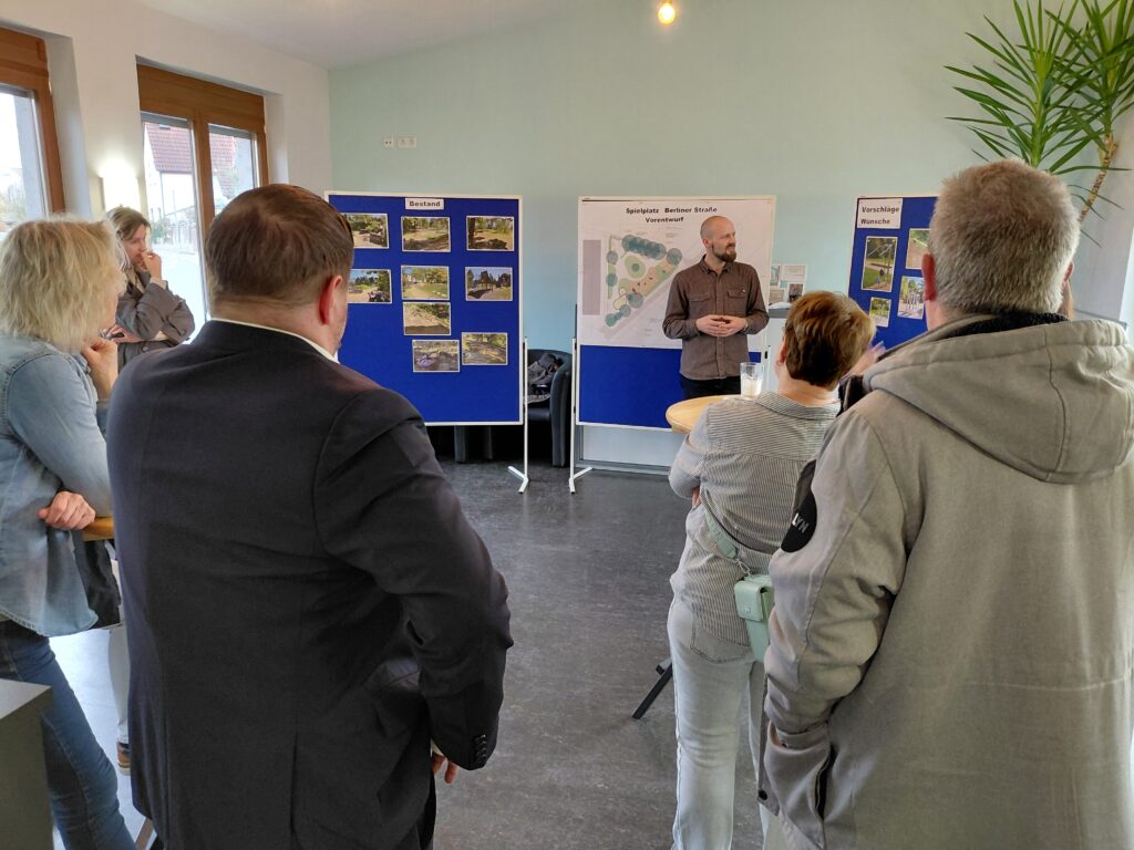 Im Anschluss daran referierte Daniel Knop vom Bereich Grünflächen des Liegenschaftsamts darüber, wie eine Umgestaltung geplant ist. Auf drei Moderationstafeln zeigte er „Ist – Soll – Umsetzung“: Fotos der derzeitigen Situation, eine Skizze, auf der sichtbar war, welche Flächen mit Spielgeräten und Bepflanzung belegt sind. Auf Nummer drei gab es Fotos zu sehen, die zeigten, welche Spielgeräte auf dem Platz hinzukommen könnten.